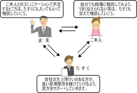 就職初期段階では、職場に同行・訪問し、働きやすい環境づくりに